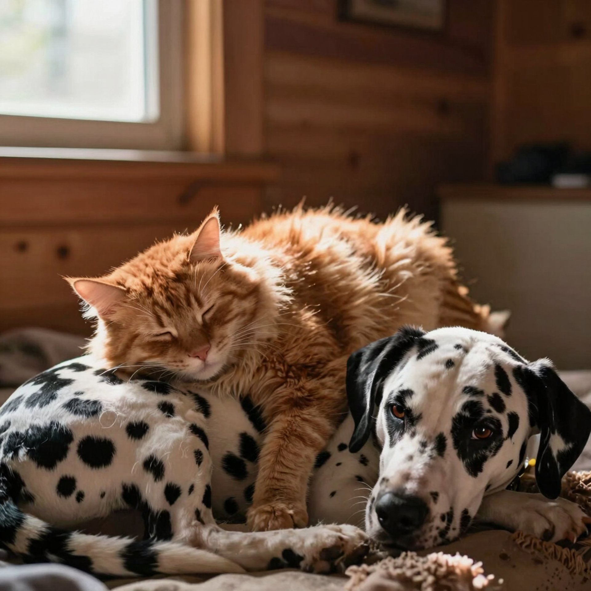 A content cat resting on a soft orthopedic bed bathed in warm afternoon light.
